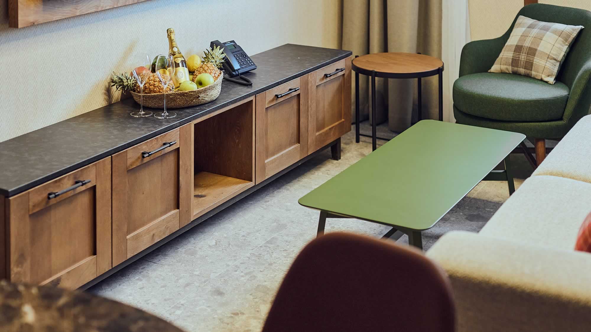 Luksuzni enterijer ovih apartmana ulepšan je prirodnim materijalima poput drveta i kamena. Površine su 36.3 – 49 m2. Imaju odvojenu spavaću sobu sa francuskim ležajem, dnevnu sobu sa sofom i kupatilo sa tuš kabinom. Elegantna linija nameštaja doprinosi modernom izgledu koji će Vas privući poput magneta. Pojedine smeštajne jedinice poseduju i balkone.